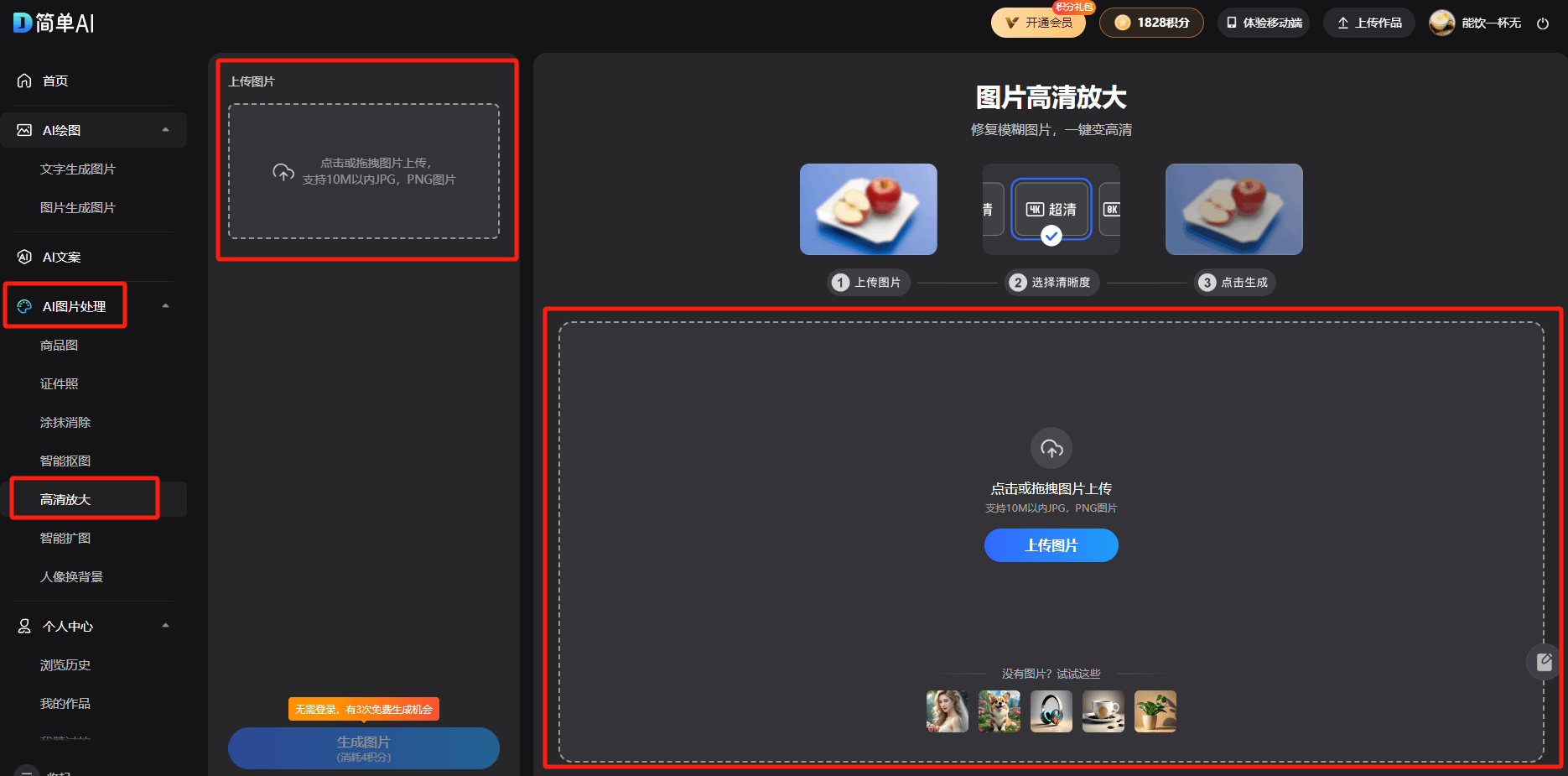 起首我们选择左侧栏【AI图片处置】中的高清放大
